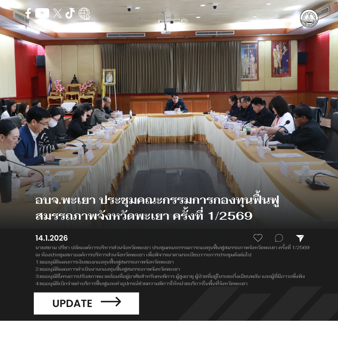 วันที่ 14 มกราคม 2569 นายธวัช สุทธวงค์ นายกองค์การบริหารส่วนจังหวัดพะเยา มอบหมายให้ นายสยาม ปรีชา ปลัดองค์การบริหารส่วนจังหวัดพะเยา ประชุมคณะกรรมการกองทุนฟื้นฟูสมรรถภาพจังหวัดพะเยา ครั้งที่ 1/2569 ณ ห้องประชุมสภาองค์การบริหารส่วนจังหวัดพะเยา เพื่อพิจารณาตามระเบียบวาระการประชุมดังต่อไป