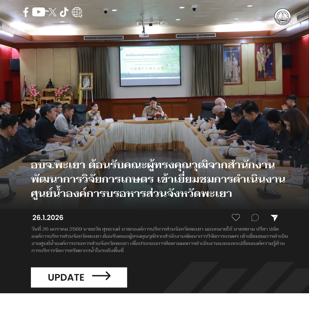 วันที่ 26 มกราคม 2569 นายธวัช สุทธวงค์ นายกองค์การบริหารส่วนจังหวัดพะเยา มอบหมายให้ นายสยาม ปรีชา ปลัดองค์การบริหารส่วนจังหวัดพะเยา ต้อนรับคณะผู้ทรงคุณวุฒิจากสำนักงานพัฒนาการวิจัยการเกษตร เข้าเยี่ยมชมการดำเนินงานศูนย์น้ำองค์การบริหารส่วนจังหวัดพะเยา เพื่อประกอบการติดตามผลการดำเนินงานและแลกเปลี่ยนองค์ความรู้ด้านการบริหารจัดการทรัพยากรน้ำในระดับพื้นที่