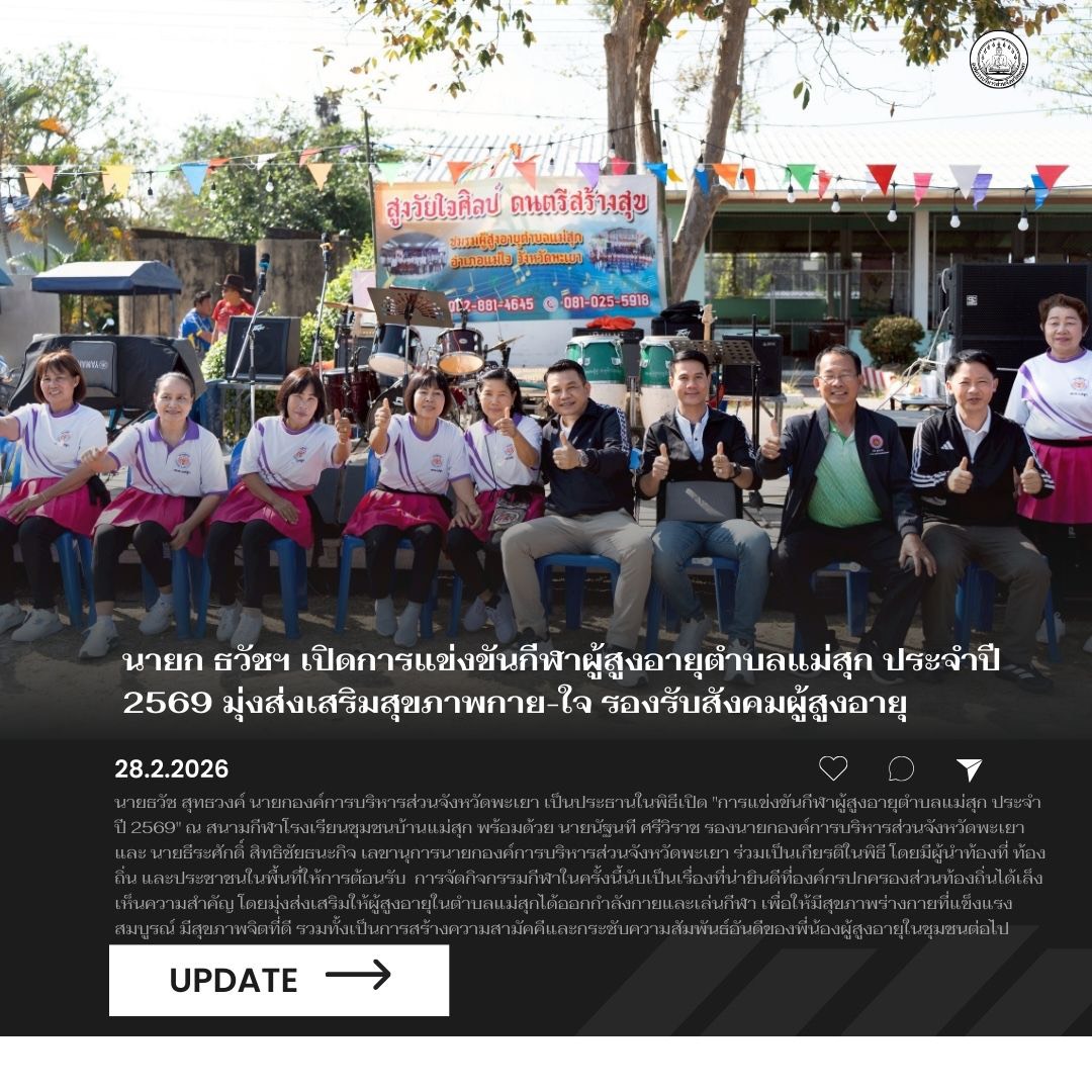 วันที่ 28 กุมภาพันธ์ 2569 นายธวัช สุทธวงค์ นายกองค์การบริหารส่วนจังหวัดพะเยา เป็นประธานในพิธีเปิด “การแข่งขันกีฬาผู้สูงอายุตำบลแม่สุก ประจำปี 2569” ณ สนามกีฬาโรงเรียนชุมชนบ้านแม่สุก พร้อมด้วย นายนัฐนที ศรีวิราช รองนายกองค์การบริหารส่วนจังหวัดพะเยา และ นายธีระศักดิ์ สิทธิชัยธนะกิจ เลขานุการนายกองค์การบริหารส่วนจังหวัดพะเยา ร่วมเป็นเกียรติในพิธี โดยมีผู้นำท้องที่ ท้องถิ่น และประชาชนในพื้นที่ให้การต้อนรับ
