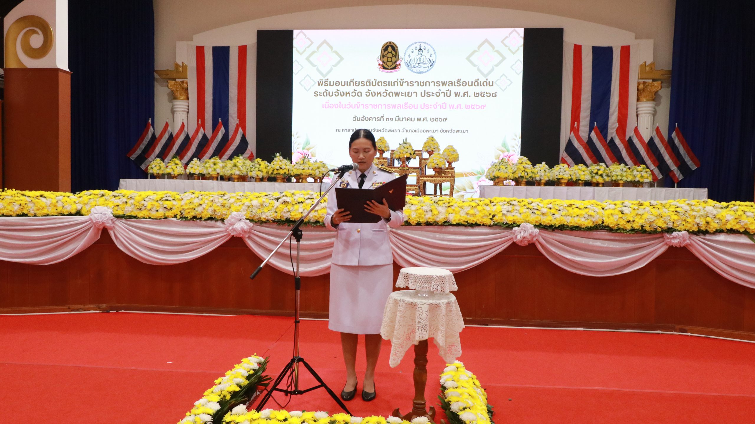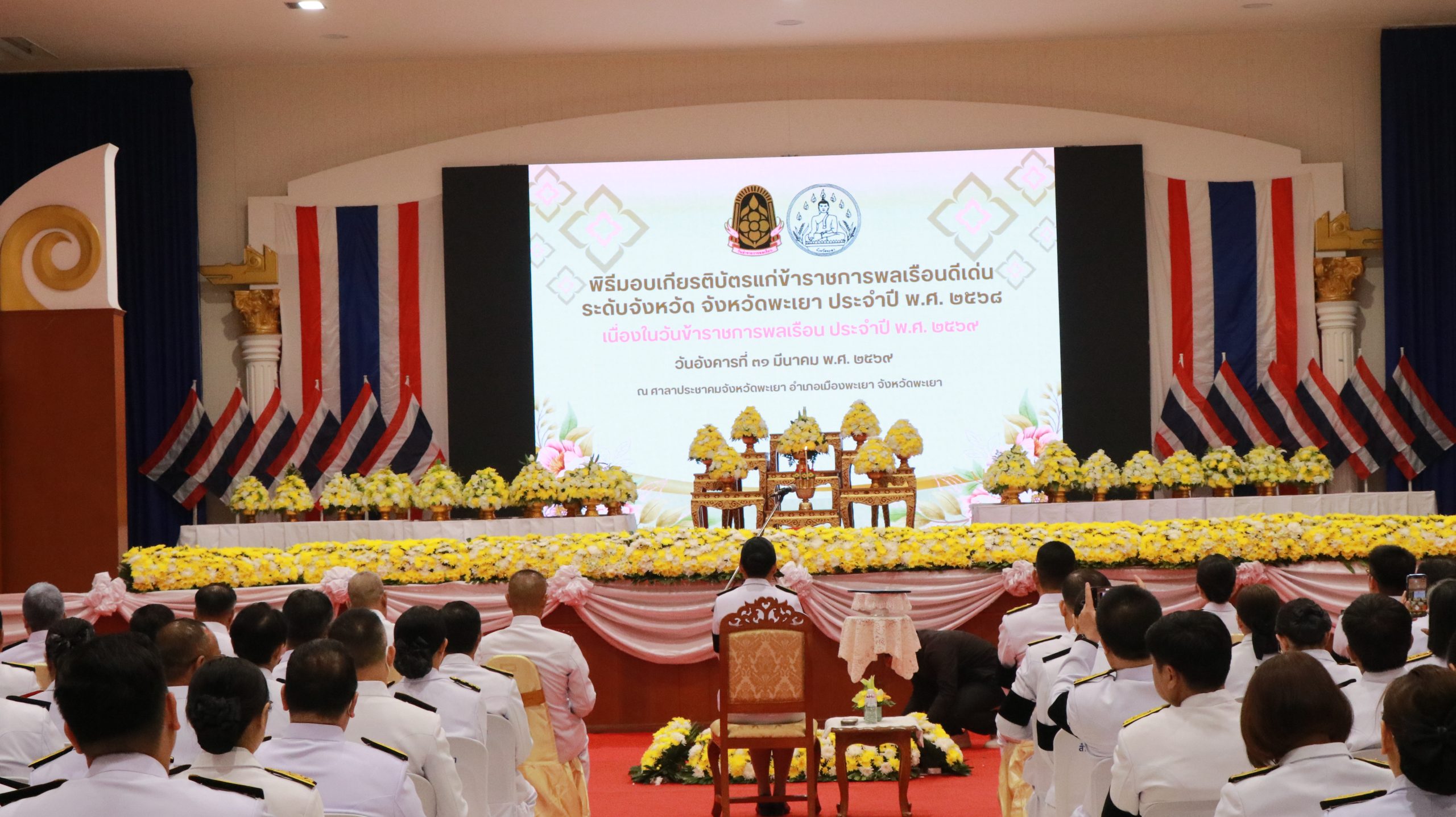 วันที่ 31 มีนาคม 2569 นายธวัช สุทธวงค์ นายกองค์การบริหารส่วนจังหวัดพะเยา มอบหมายให้ นางสาวเบญจกร ร่องสุวรรณ รองปลัดองค์การบริหารส่วนจังหวัดพะเยา เข้าร่วมพิธีข้าราชการพลเรือน ประจำปี พ.ศ 2569 โดยมี นางสาวอรอาภา โล่ห์วีระ ผู้ว่าราชการจังหวัดพะเยา เป็นประธานในพิธี ณ ศาลาประชาคมจังหวัดพะเยา