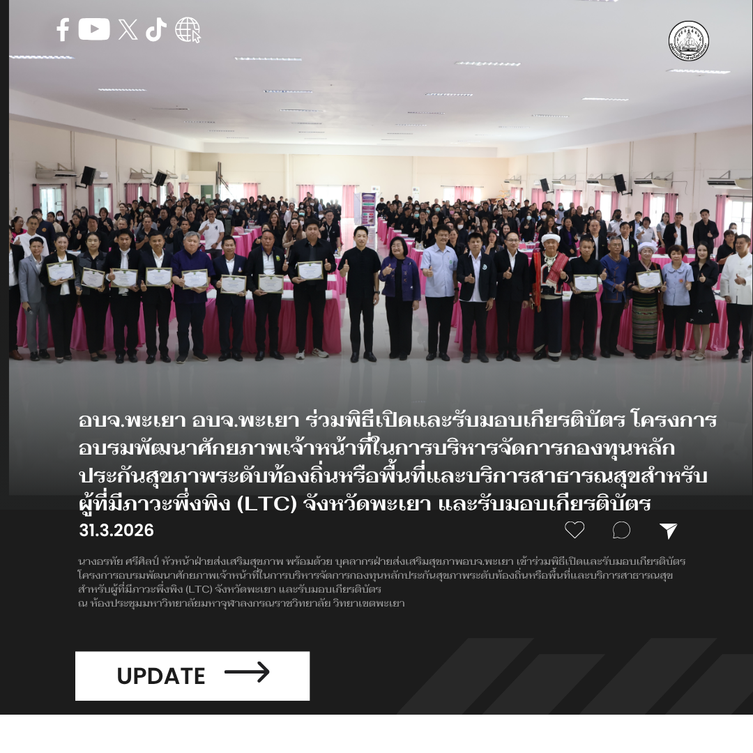 วันที่ 31 มีนาคม 2569 นายธวัช สุทธวงค์ นายกองค์การบริหารส่วนจังหวัดพะเยา มอบหมายให้ นางอรทัย ศรีศิลป์ หัวหน้าฝ่ายส่งเสริมสุขภาพ พร้อมด้วย บุคลากรฝ่ายส่งเสริมสุขภาพอบจ.พะเยา เข้าร่วมพิธีเปิดและรับมอบเกียรติบัตร โครงการอบรมพัฒนาศักยภาพเจ้าหน้าที่ในการบริหารจัดการกองทุนหลักประกันสุขภาพระดับท้องถิ่นหรือพื้นที่และบริการสาธารณสุขสำหรับผู้ที่มีภาวะพึ่งพิง (LTC) จังหวัดพะเยา